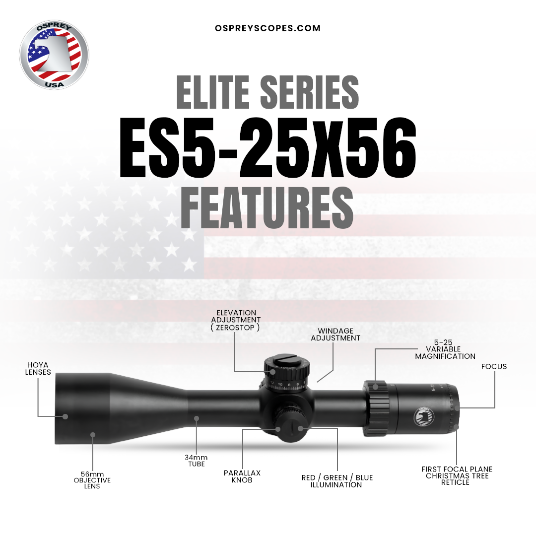 The Osprey USA ES5-25×56 FFP Scope delivers reliable performance for shooters. High-quality Hoya glass with a multi-coated flat black finish provides clear visuals and consistent light transmission. The 34mm tube offers durability and a wide adjustment range, while generous eye relief ensures comfortable use. This scope is backed by Osprey’s lifetime warranty.